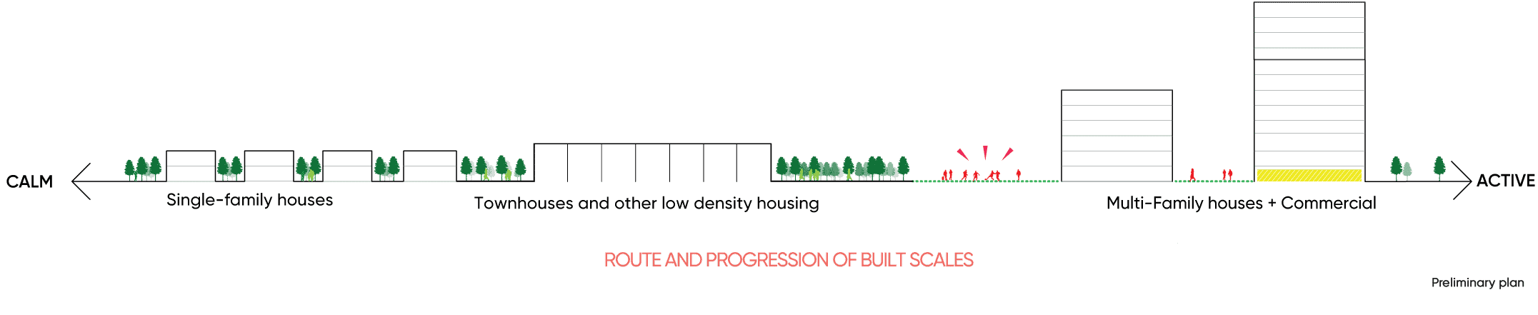 The preliminary concept for the site’s layout was developed based on the desire to create a living environment that fits in seamlessly with its surroundings. The layout of the various types of housing (single-family homes, townhouses, and condos) is done in a way so that there is a gradual increase in height and density throughout the space.