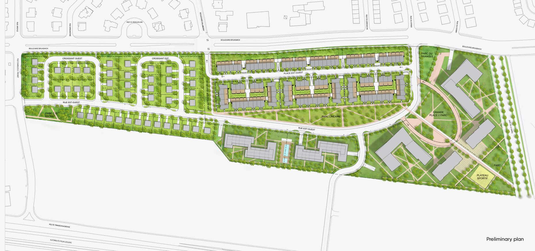 The Charles-E. Frosst site is a vacant industrial lot of over 1.5 million square feet located on Brunswick Boulevard. Prével and its partner TGTA have been working for several years on the development of this large site. The goal is to create a new residential neighbourhood, inspired by best real estate development practices that are focused on sustainability, community, mobility, and providing a high quality of life for residents.